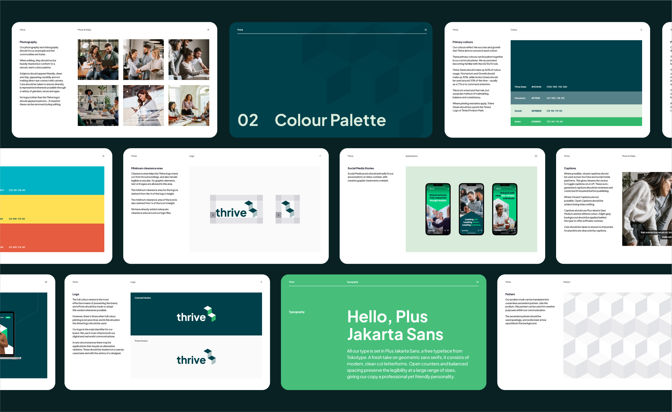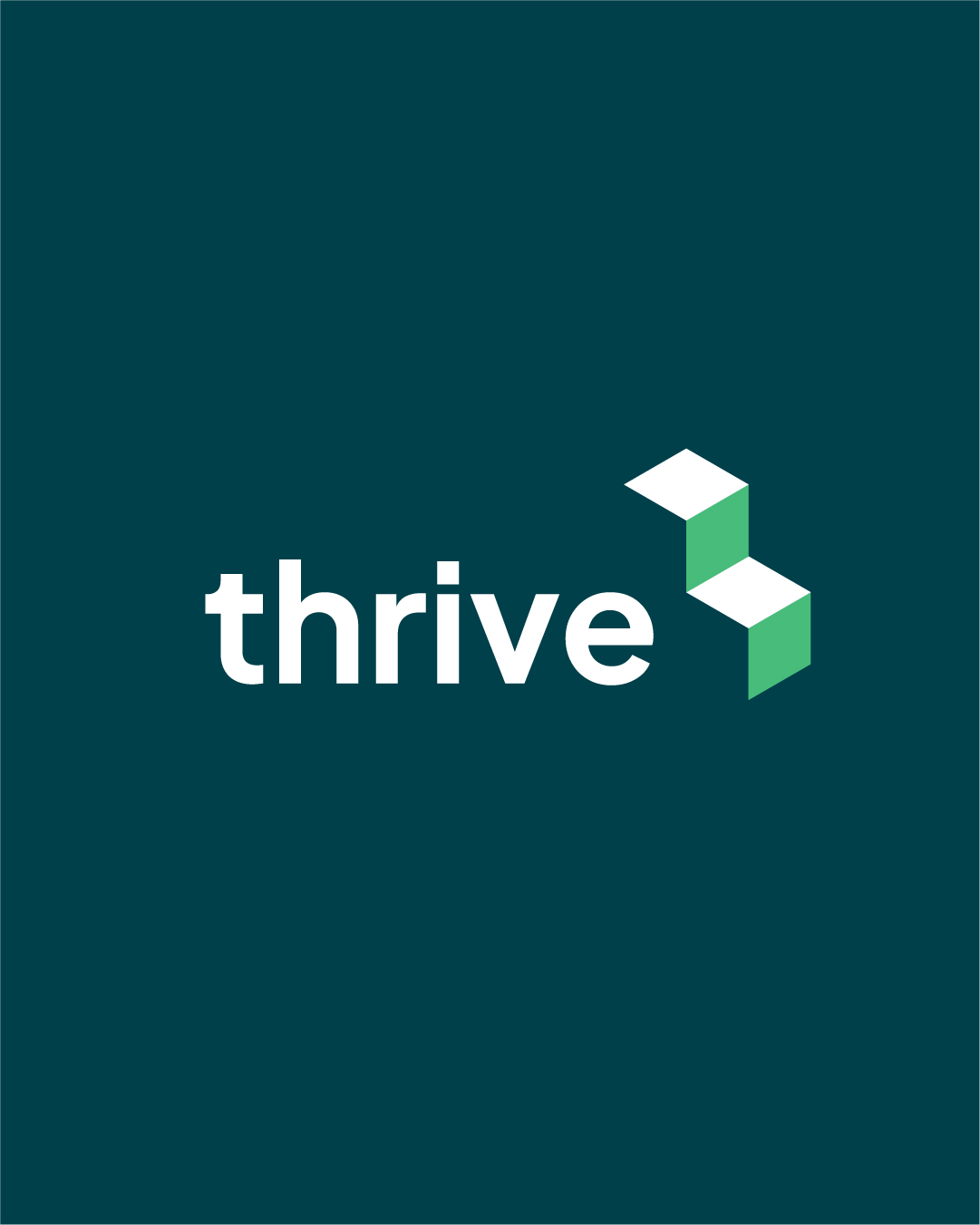 Focusing on the personal development and career progression that Thrive nurtures, we proposed a podium (or staircase) mark. Alone, it acts as a simple visual motif for the brand – and when tiled, it becomes a progressive pattern that can be used creatively across communications.
